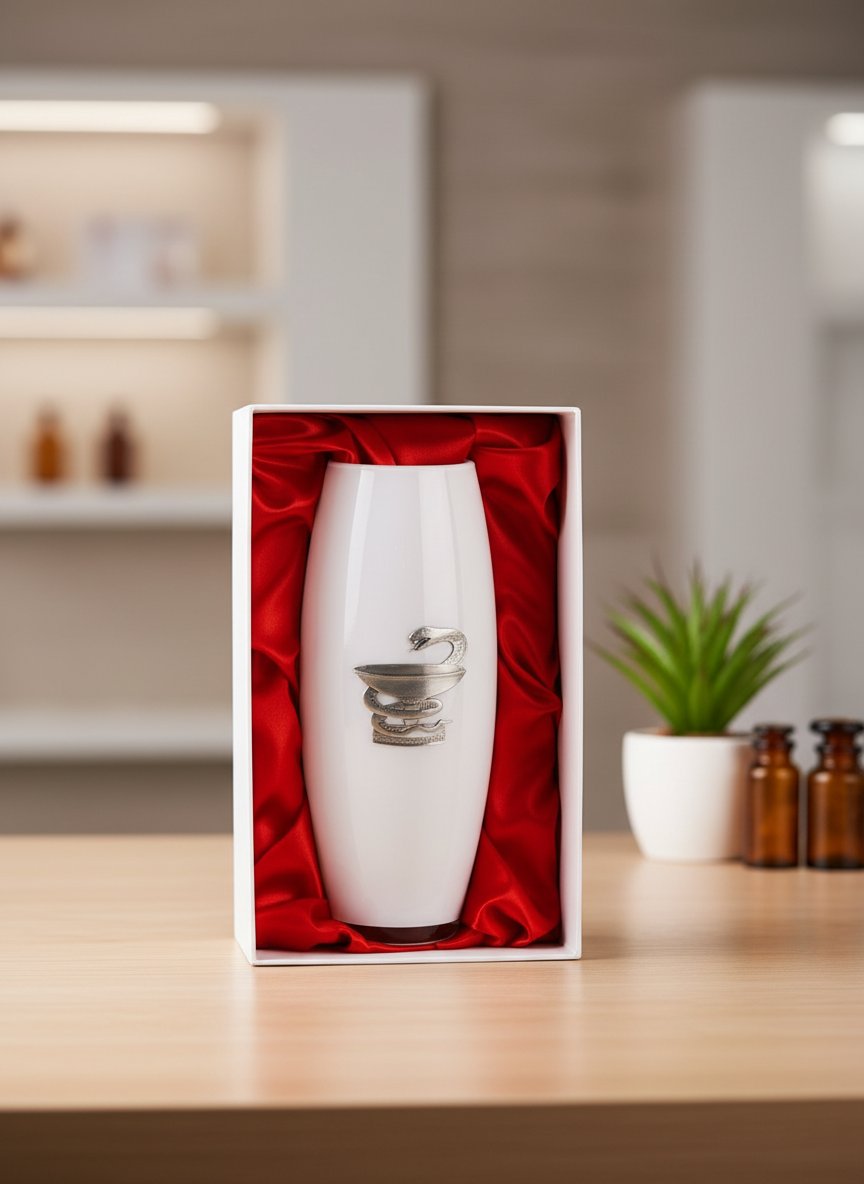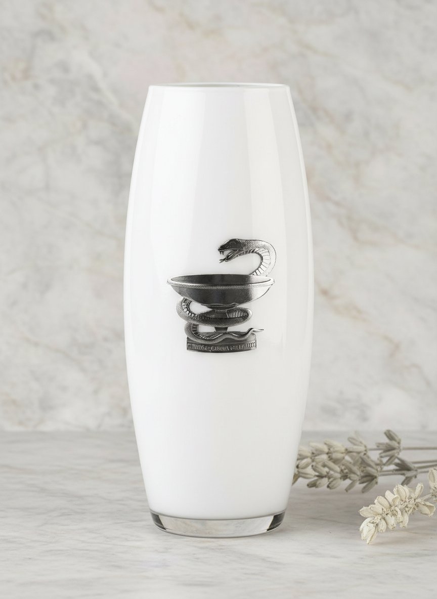 Декоративное оформление вазы подчёркивает индивидуальность подарка. В центре изделия размещён необычный и запоминающийся барельеф, который неразрывно связан с профессией одариваемого — сосуд Гигеи, самый главный символ медицины. Накладка в виде чаши со змеёй изготовлена по ювелирной технологии из специального сплава с содержанием олова не менее 95%, он именуется пьютер. Вручную, методом художественного литья был изготовлен этот барельеф, а последующая полировка и чернение придали ему вид антикварного серебра. Чудесная работа мастера, которой хочется любоваться бесконечно, словно произведением искусства в музее.