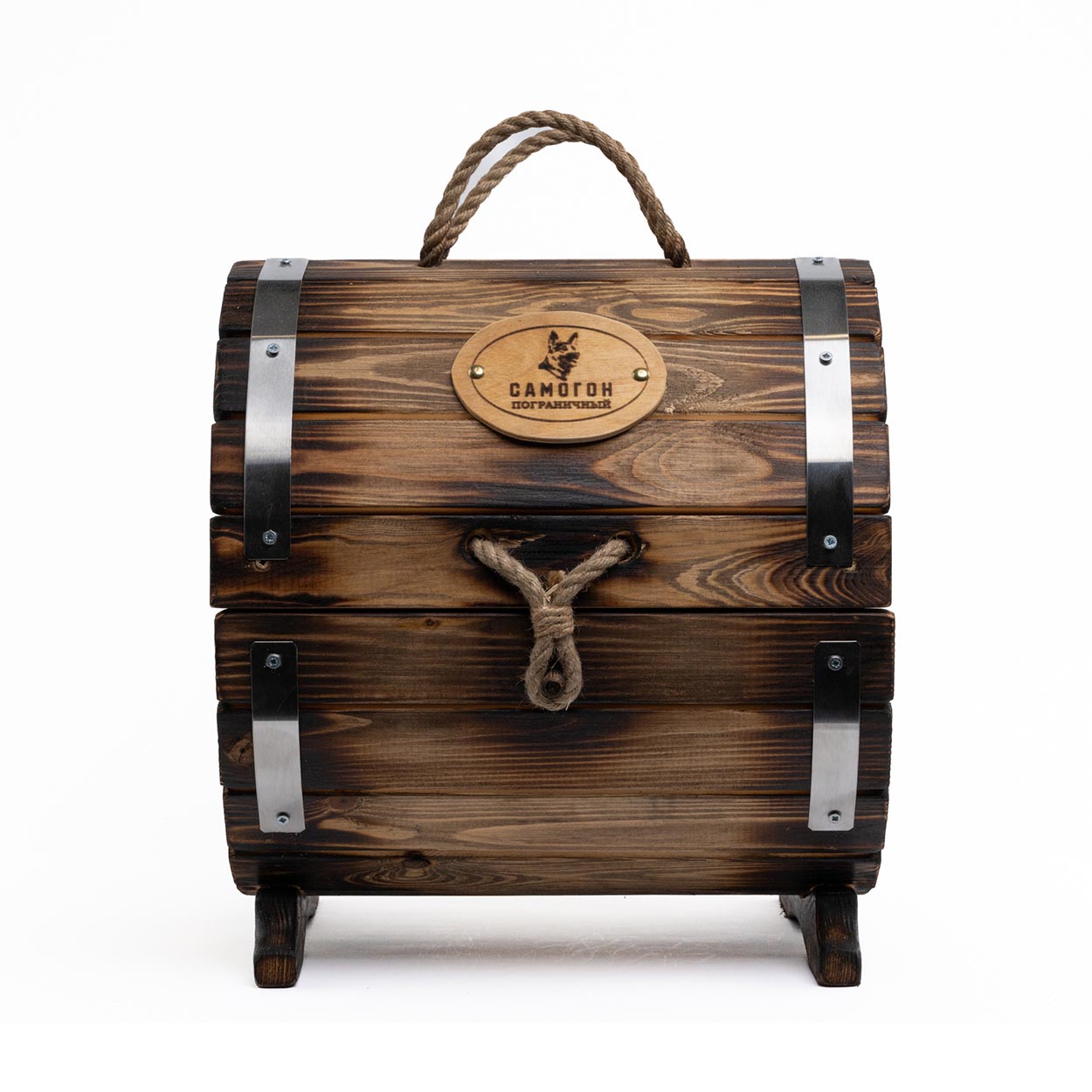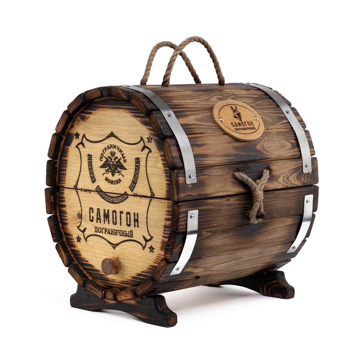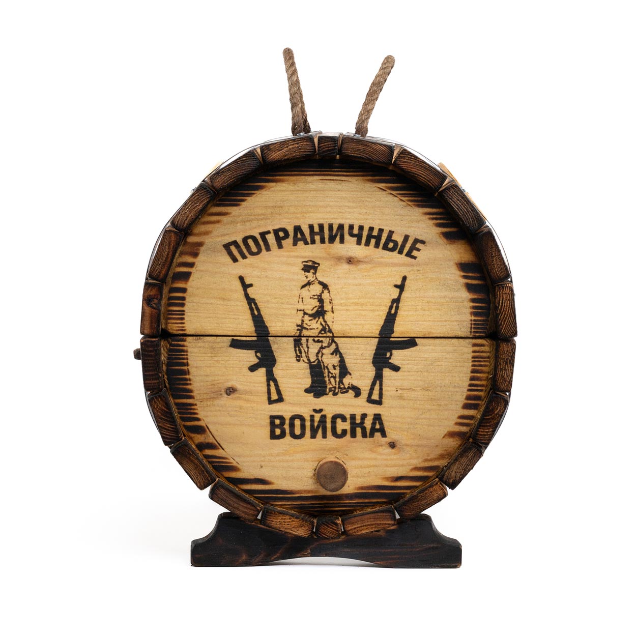 Эксклюзивное внешнее оформление мини-бара «Пограничные войска» посвящено мужественным охранителям государственных границ. На одном из торцов «праздничного бочонка» методом горячего клеймения изображены фигура пограничника и пара автоматов Калашникова в сопровождении названия аксессуара, выполненного эффектным шрифтом. Второй торец облагорожен эмблемой погранвойск России, а также надписями «Бывших пограничников не бывает» и «Самогон пограничный».