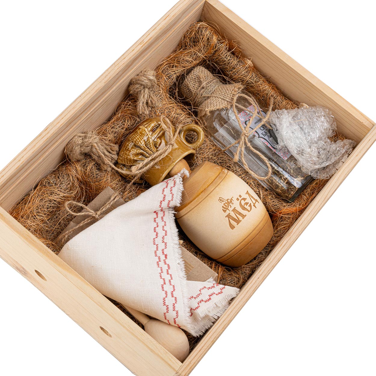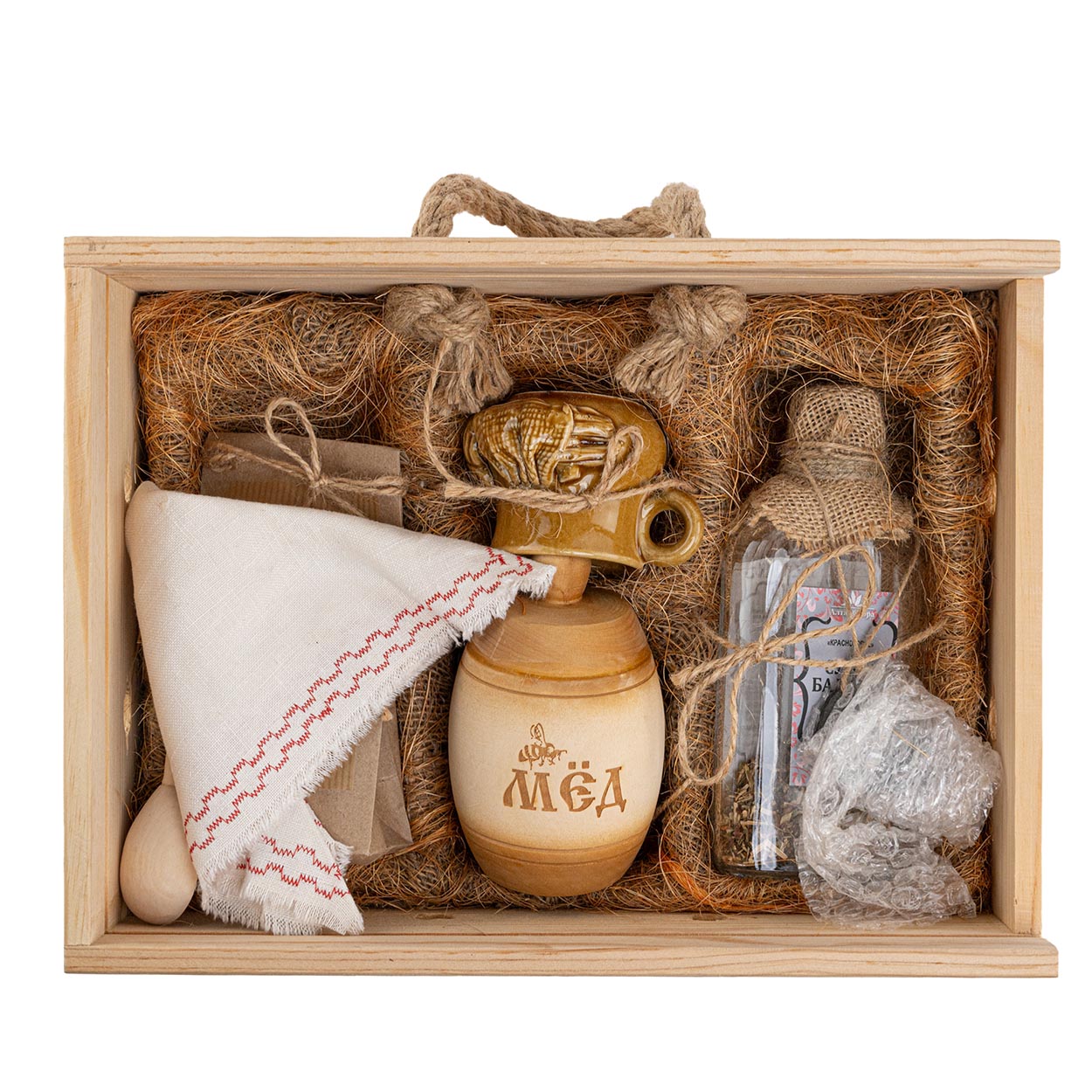 Наполнение короба - из самого сердца Алтайского края. Целебный мёд в бочонке, травяной чай, собранный в самом экологически чистом районе России, безалкогольный бальзам, который подарит вам море здоровья и капельку сибирского солнца. Древнее изображение этого солнца в виде литого металлического оберега висит на бутылочке бальзама. А ещё в наборе керамическая чайная чашка, кедровая ложечка и льняная салфетка с изображением могучего сибирского кедра. Все компоненты набора уложены в стильный ложемент из джута.