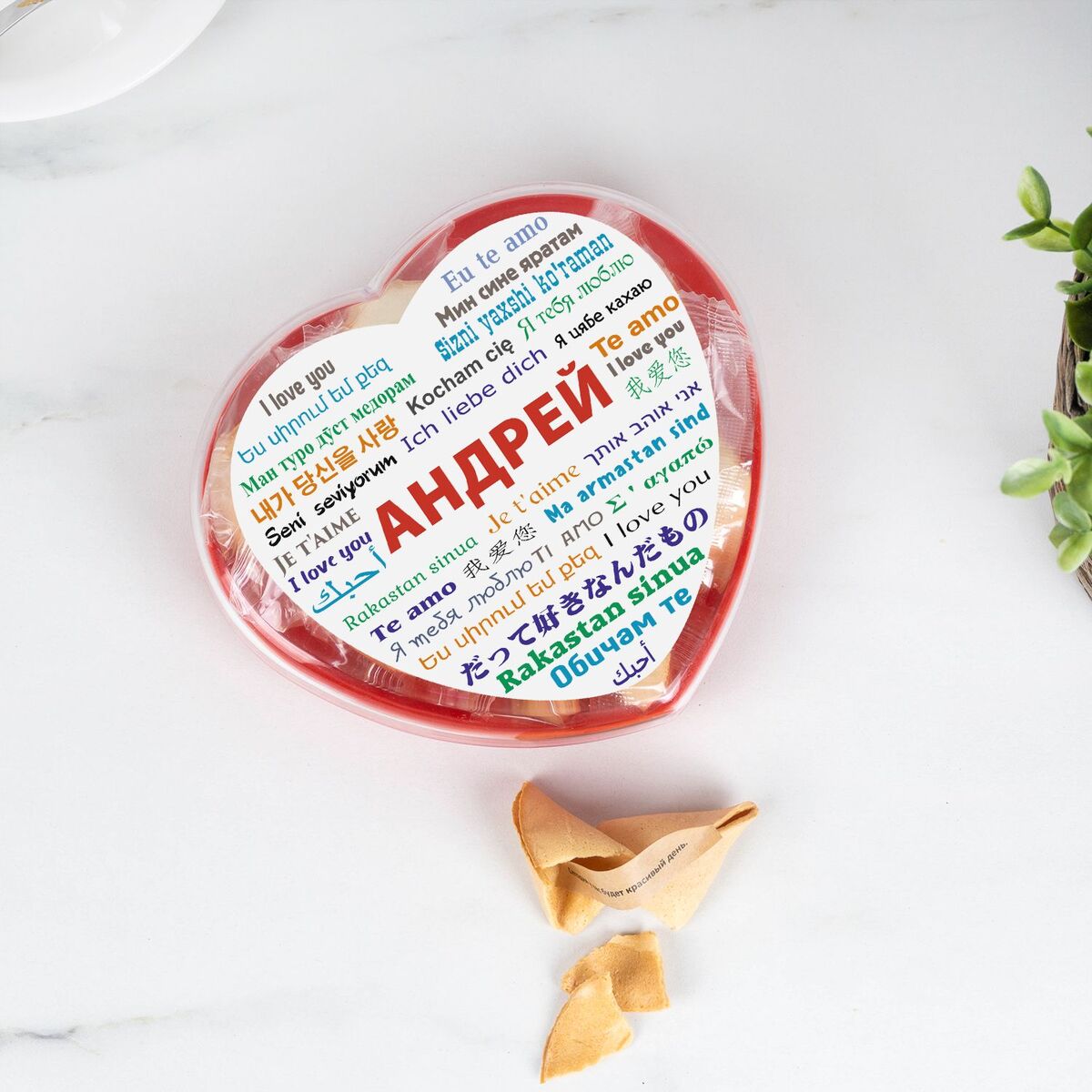 Если женщины любят ушами, то мужчины — глазами, и ни один из представителей сильного пола не может остаться равнодушным к декоративному оформлению подарочной упаковки печенья. Яркая, эффектная, она поразит одариваемого с первого взгляда. Во-первых, потому что на пластиковом боксе в форме сердца он обнаружит своё собственное имя, а во-вторых, потому что имя будет в окружении признаний в любви на всех языках мира. Согласитесь, весьма необычный декор. Достаточно указать имя мужчины при оформлении заказа, и уже в течение одного дня наши специалисты украсят им упаковку.