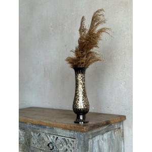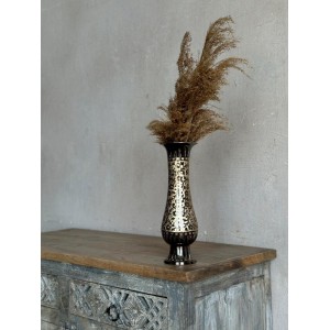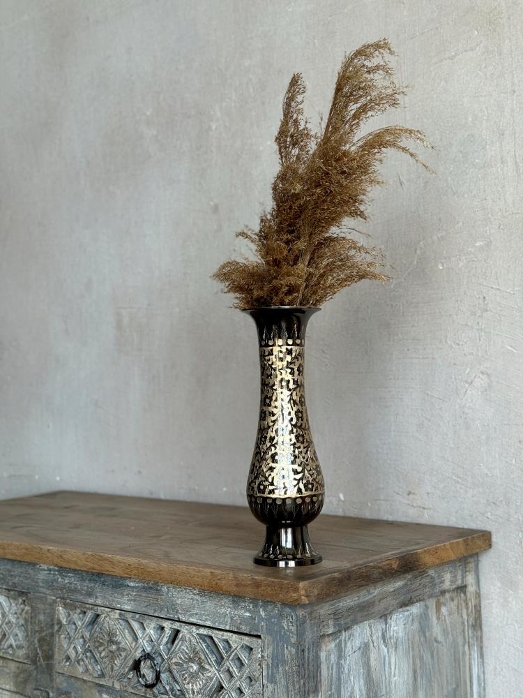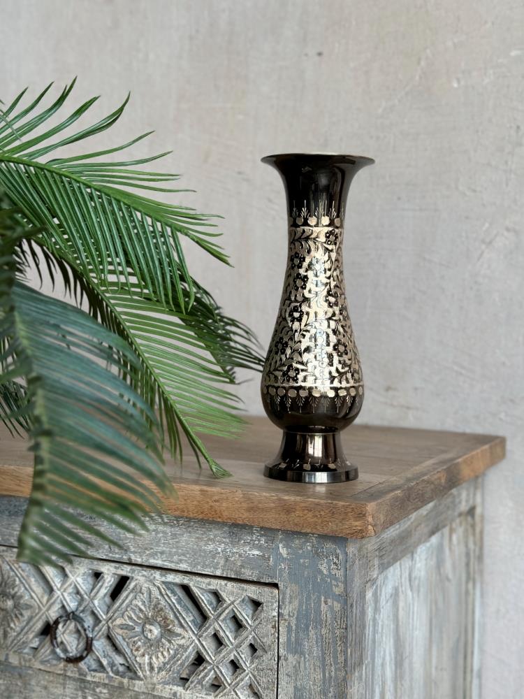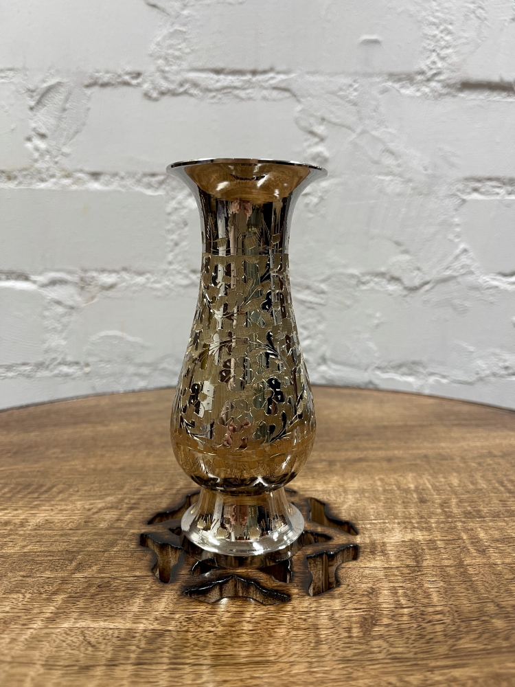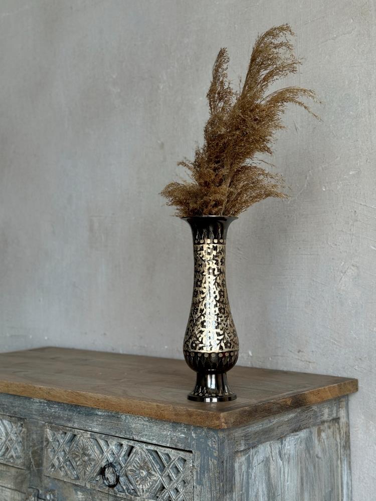 В России латунные вазы предположительно начали появляться на рубеже 16-17 веков вместе с развитием торговых отношений с Англией, чьей колонией к тому моменту являлась Индия. Сохранились упоминания о том, что однажды заморские купцы в качестве подарка двору русского царя на Покров день преподнесли «сосуд, сияющий золотым отливом с высотой в аршин». К сожалению, предмет сей до наших дней не сохранился, но ходит версия, что этот таинственный подарок – та самая ваза из Индии. Шли годы, и дворянские рода вслед за Александром Македонским со временем также прониклись красотой этих декоративных предметов интерьера и стали наперебой украшать ими свои роскошные поместья. Всё изменилось в советский период, когда заграничная экзотика стала большим дефицитом. Не обошла эта участь и латунные вазы. Во многом именно поэтому на черно-белых снимках своих бабушек и дедушек, мам и пап вы, скорее всего, увидите керамические, стеклянные или хрустальные аналоги, которые по старой традиции дарили на семейные торжества, юбилеи или новоселье.